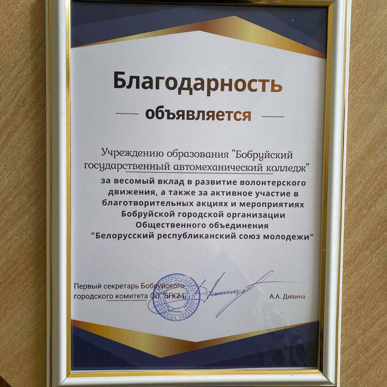 По итогам Пленума учреждению образования "Бобруйский государственный автомеханический колледж " объявлена благодарность за весомый вклад в развитии волонтерского движения, за участие в благотворительных акциях и мероприятиях.